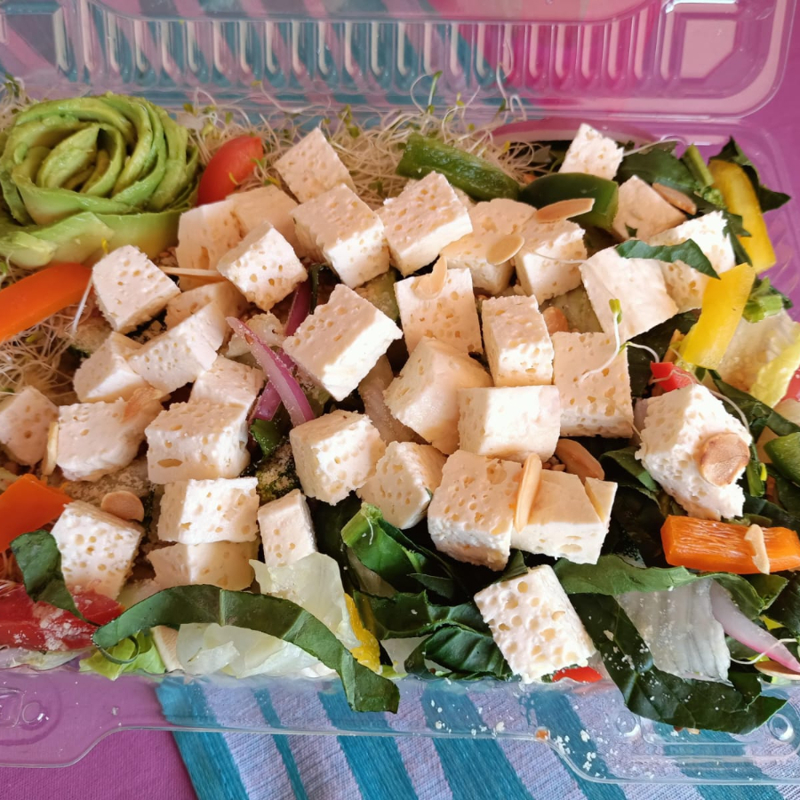 panela sobre base de lechuga romana , pepeino,jitomate,cebolla ,germinado,aguacate,germinado,