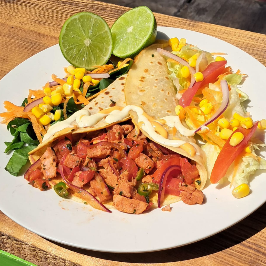 base de lechuga espinaca,queso cheddar,medallon de atun aderezos de la casa envueltos en tortilla hecha a mano 100% corga.