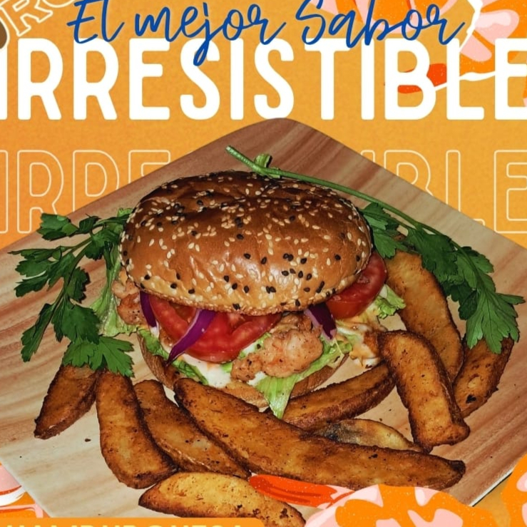 hamburguesa de camaron lechuga,jitomate,cebolla,aderezos,acompañado de papas fritas