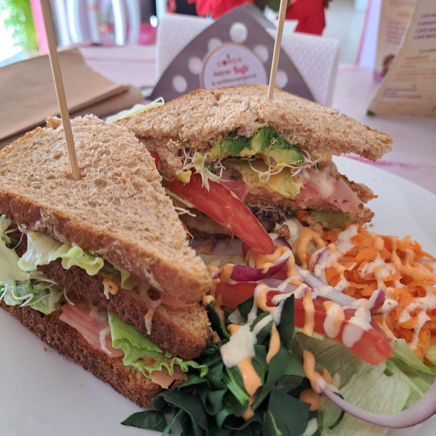pan integral,pechuga,medallon de atun,romana,jitomate,cebolla,germinado,aguacate,aderezos de la casa.