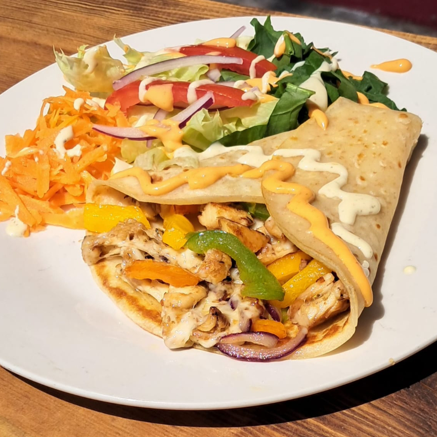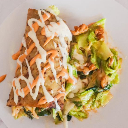 base de lechuga espinaca,queso cheddar,pechuga aderezos de la casa envueltos en tortilla hecha a mano 100% corga.