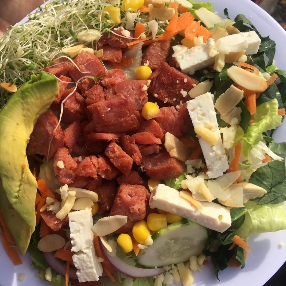 130gr de salamon con aderezo de hierbas finas lechuga romana y orejona, pepino,cebolla aguacate,queso philadelphia,nuez y piña.