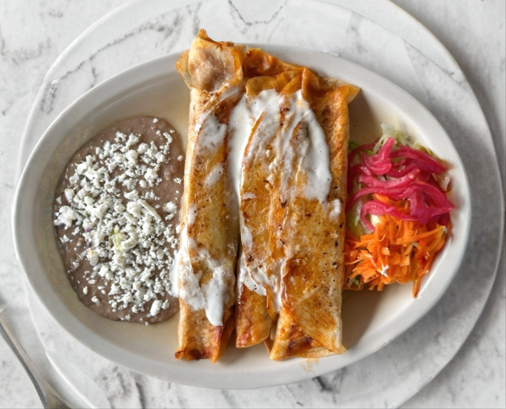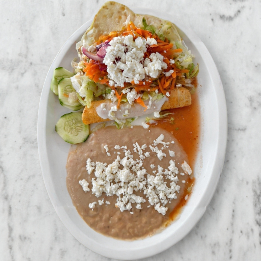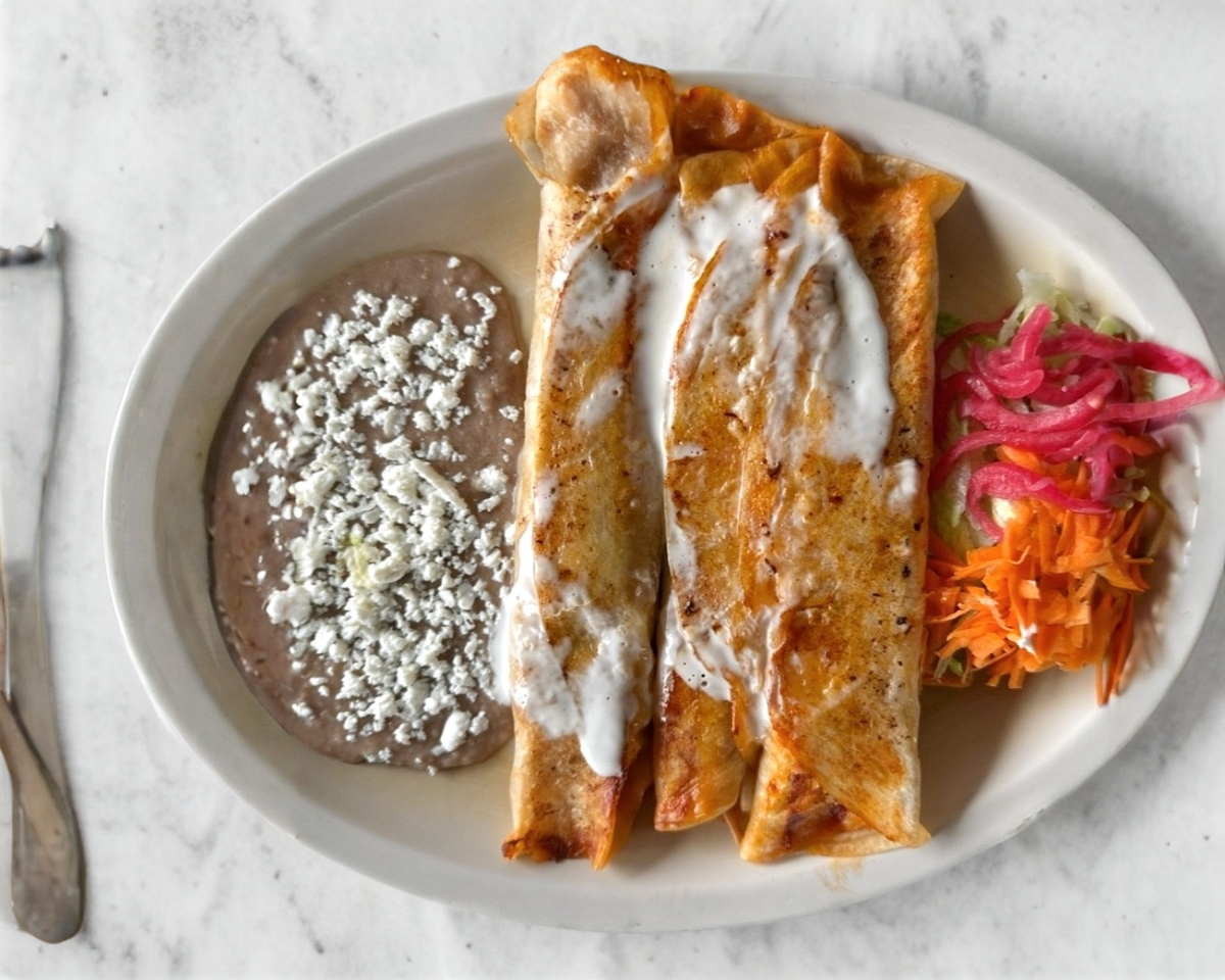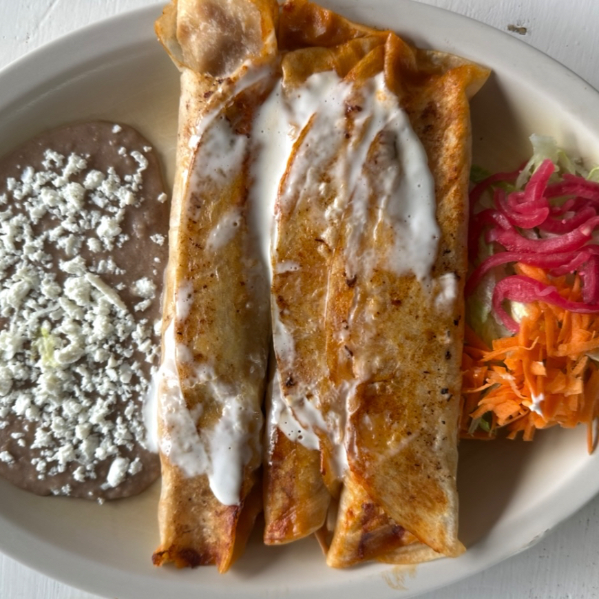 Tres Burritos Bañados con Crema, Incluye una Porción Pequeña de Frijoles y Ensalada