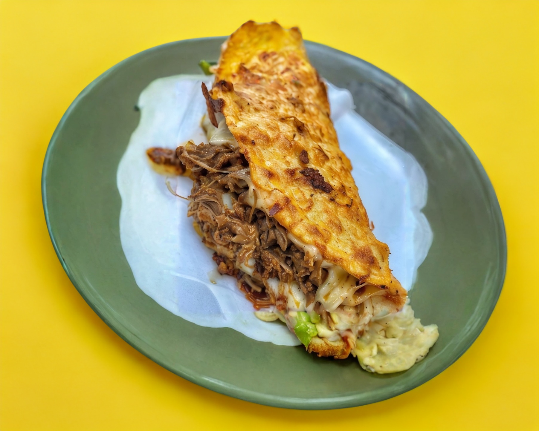 Para un antojo diferente y llenador. Disfruta la Quesabirria de harina , preparada en una suave tortilla de harina que abraza nuestra carne jugosa y mucho queso manchego gratinado. Perfecta para bañarla en salsa y limón. ¡Una delicia norteña en tu mesa!