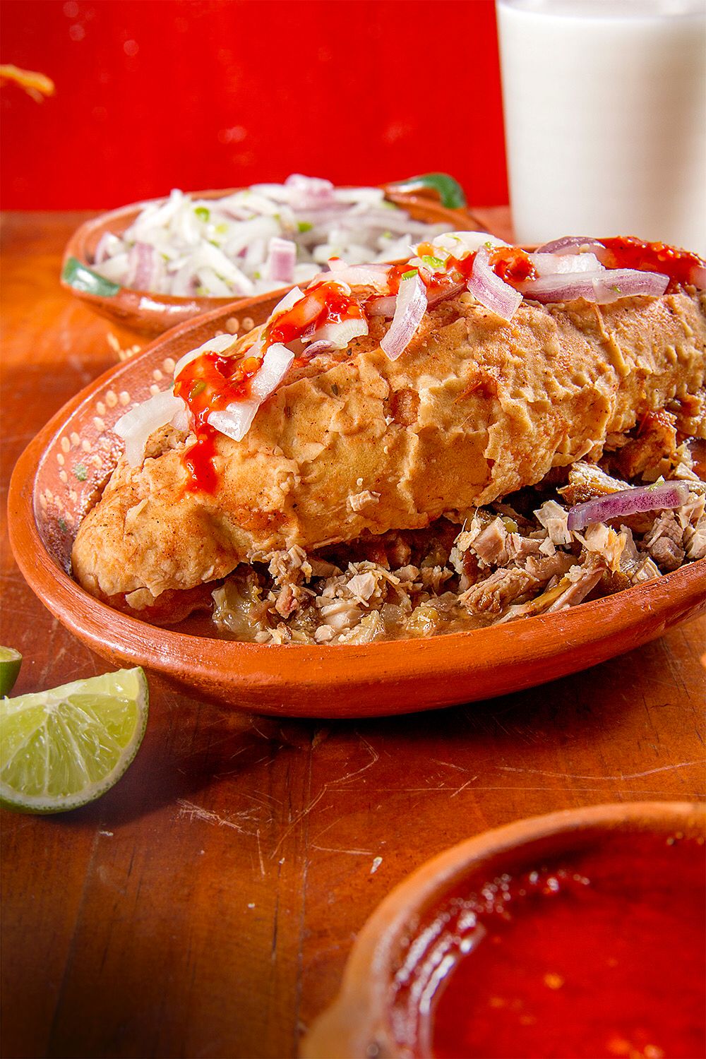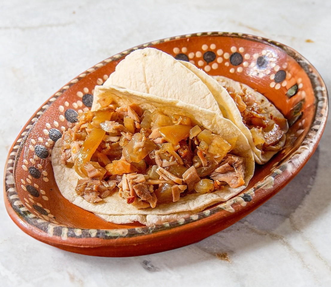Tortilla de maíz, carnitas surtidas de carne de cerdo, cuerito, Buche, incluye salsa picante, salsa suave, cebolla con habanero, limones.