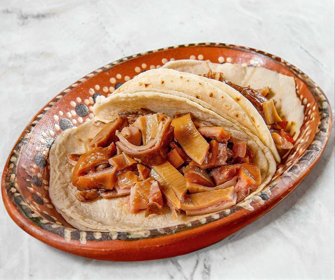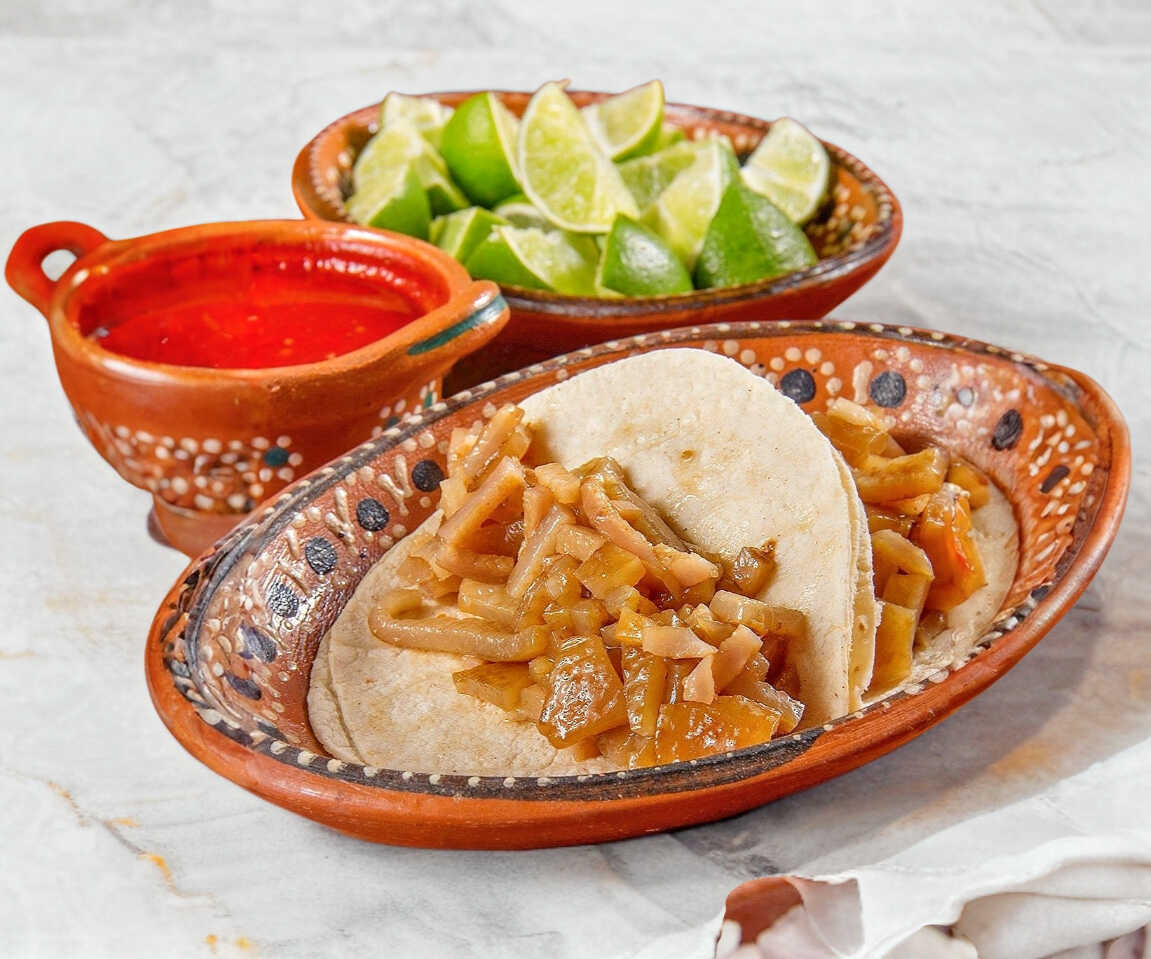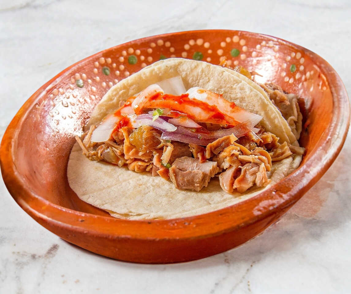 Exquisito taco de 100% cuerito, cebolla rayada, salsas suave y picante, limón y pico de gallo.