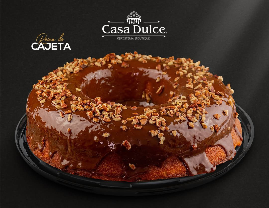 Rosca Cajeta: Esponjoso pan tipo casero sabor naranja, bañado de cajeta y nuez.