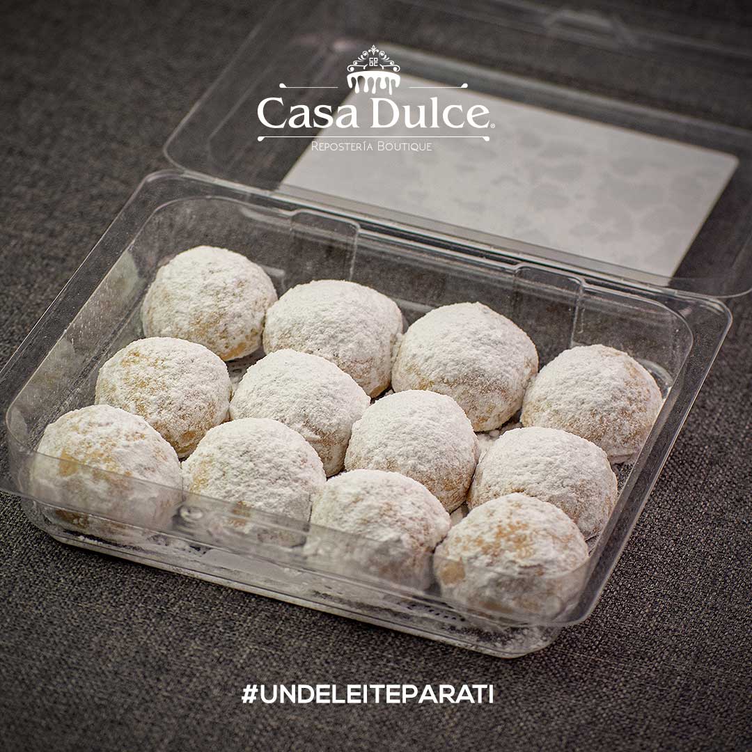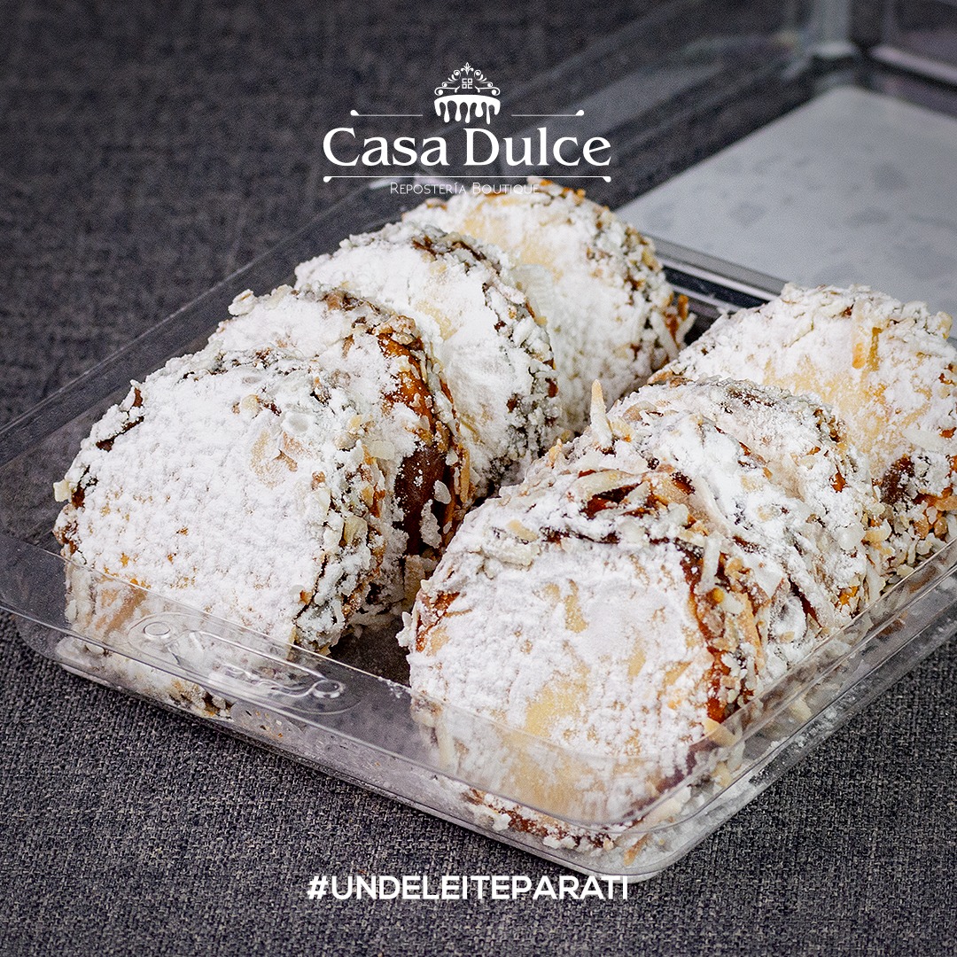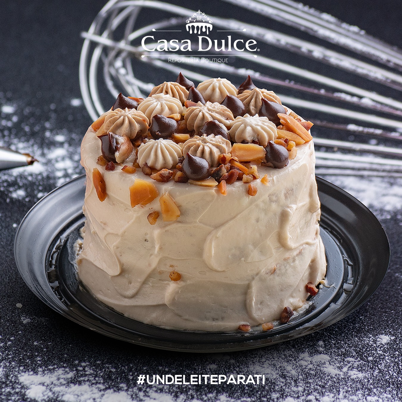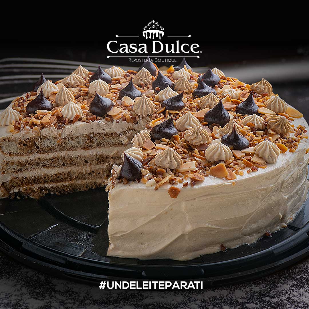 Pan de vainilla bañado en café relleno de crema nuez y almendra.