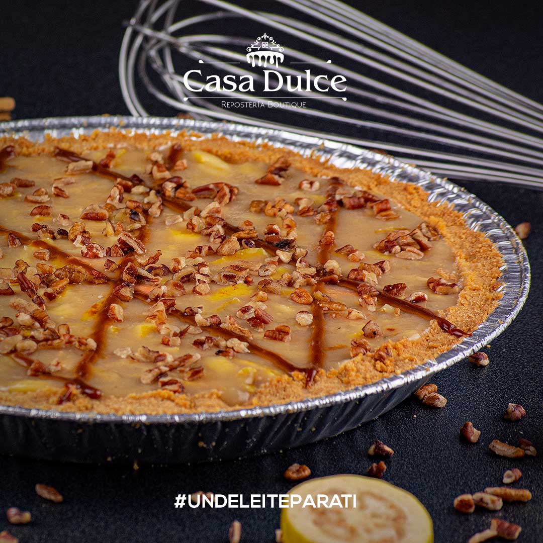 Base de galleta relleno de queso crema cubierto de guayaba cajeta y nuez.