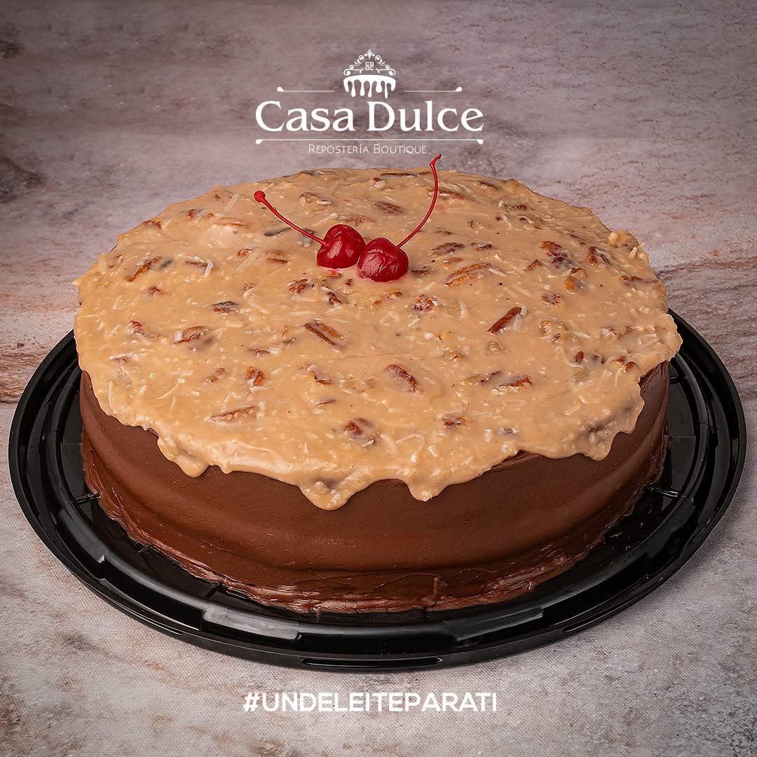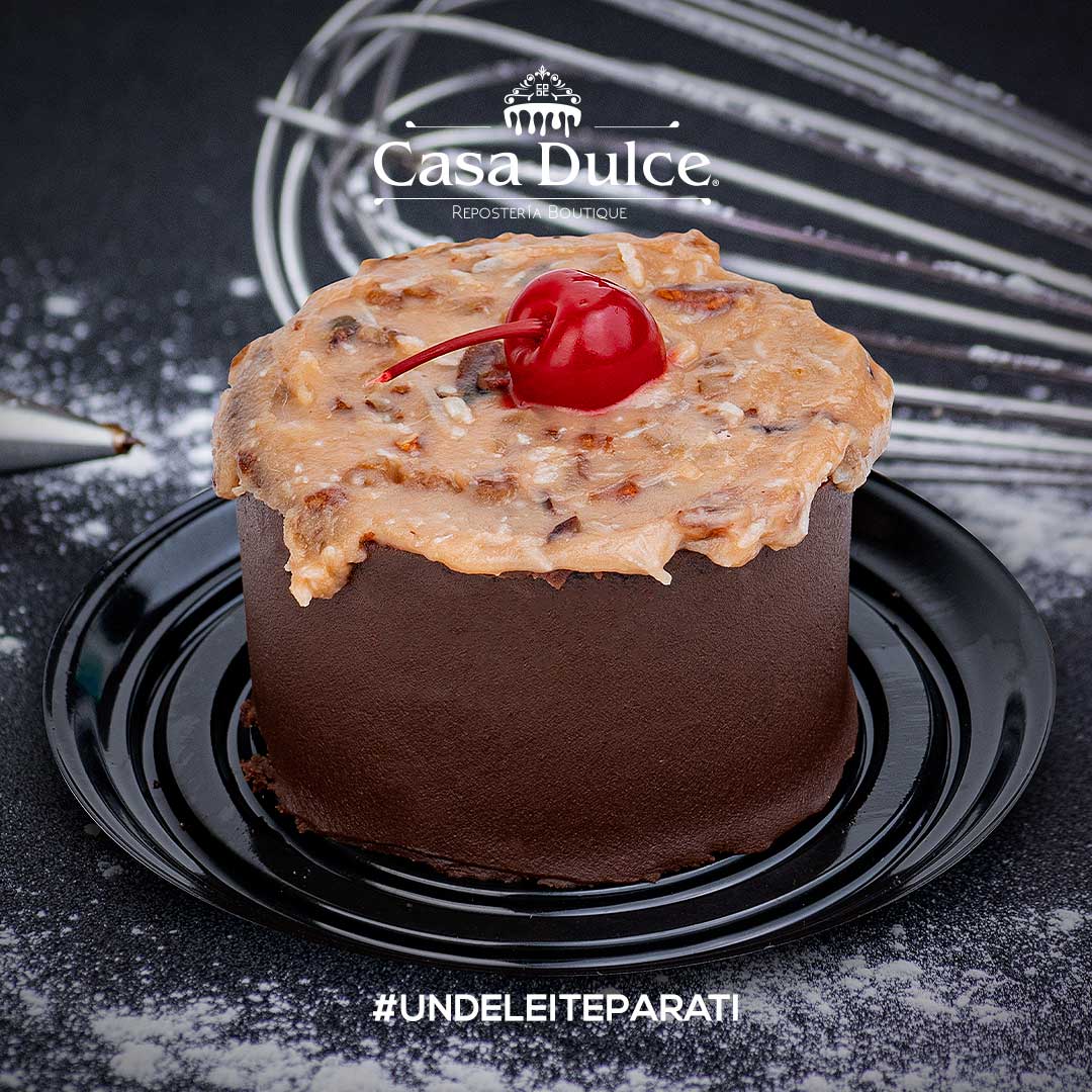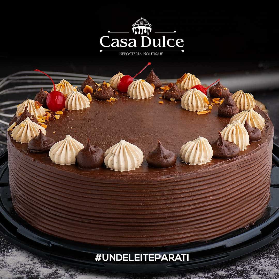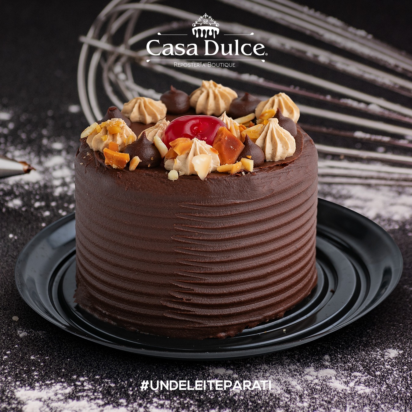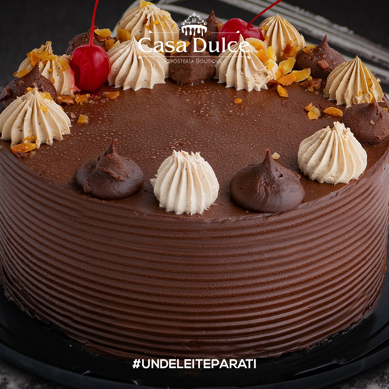 Pan de chocolate relleno de crema de café cubierto con ganache trufas y cerezas.