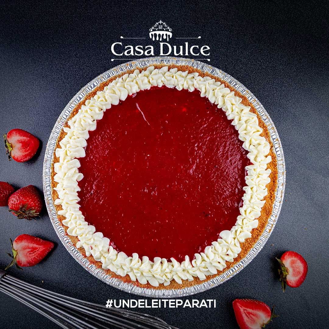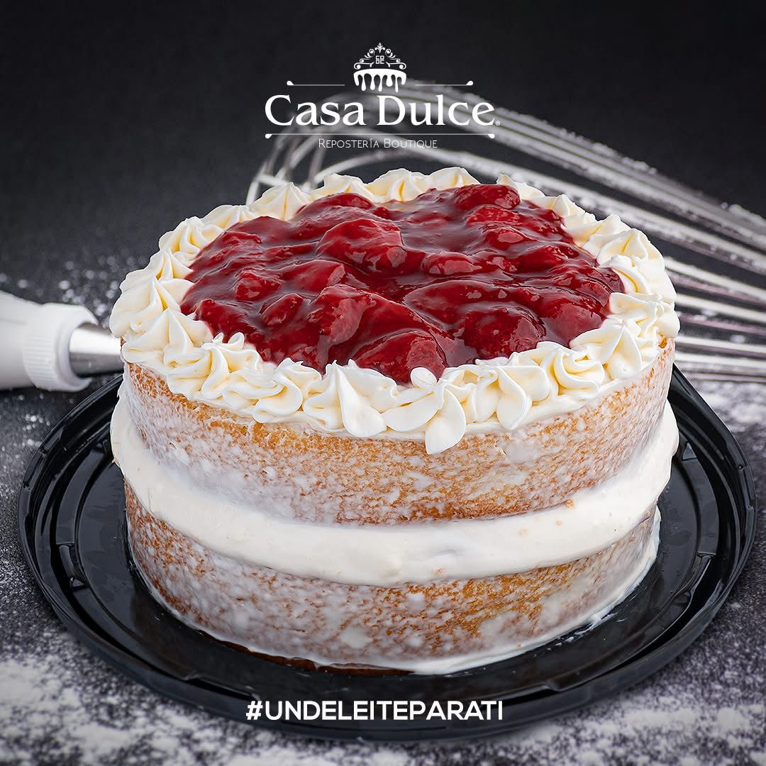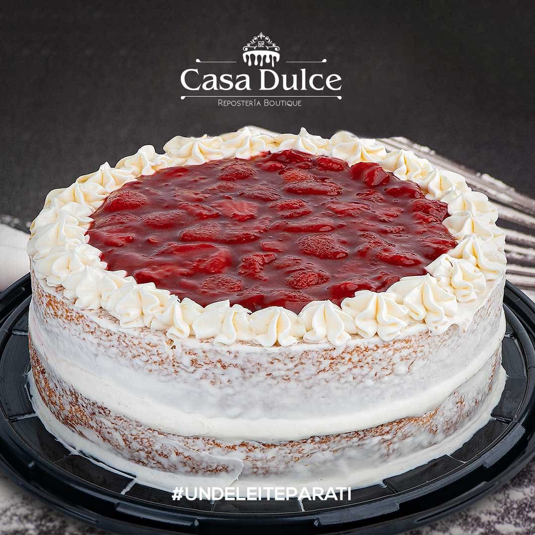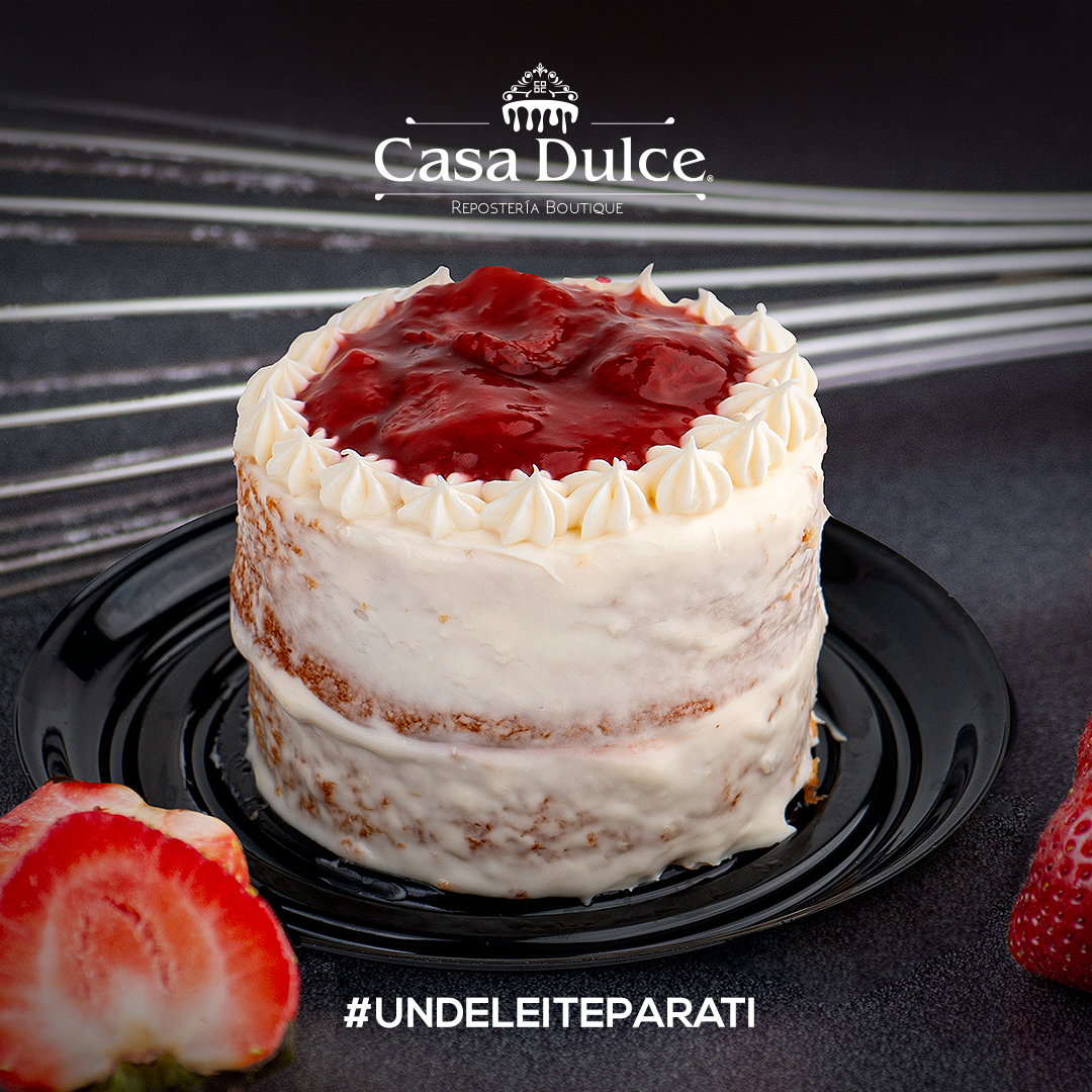 Pan de vainilla relleno de betún cremoso y fresas naturales decorado con mermelada artesanal.