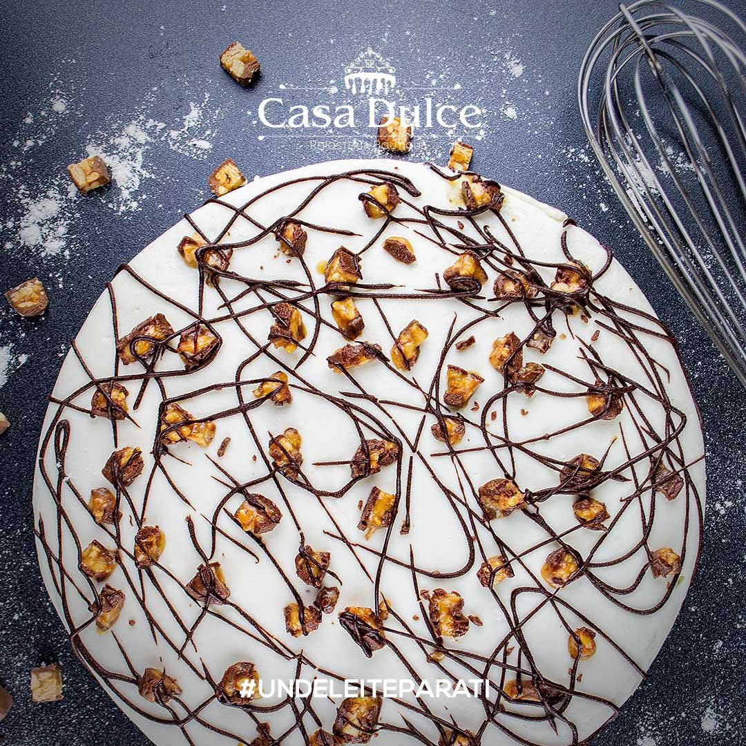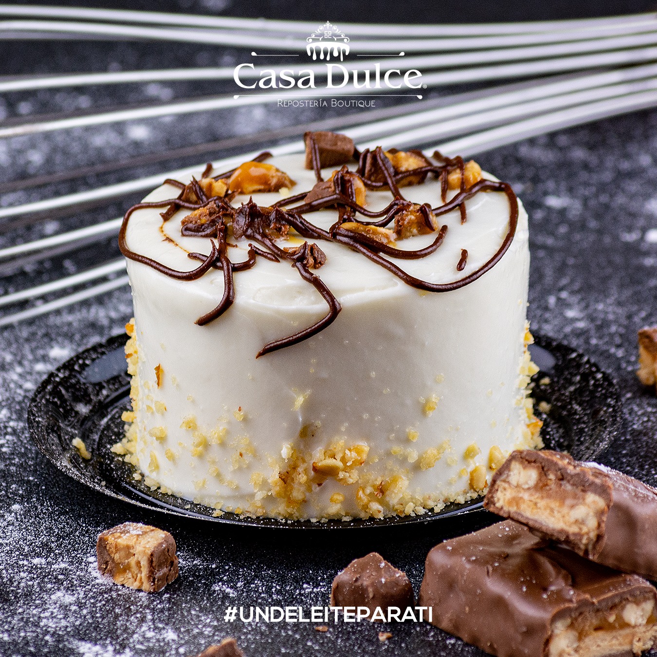 Pan de chocolate con betún de queso crema decorado con Snickers y ganache.