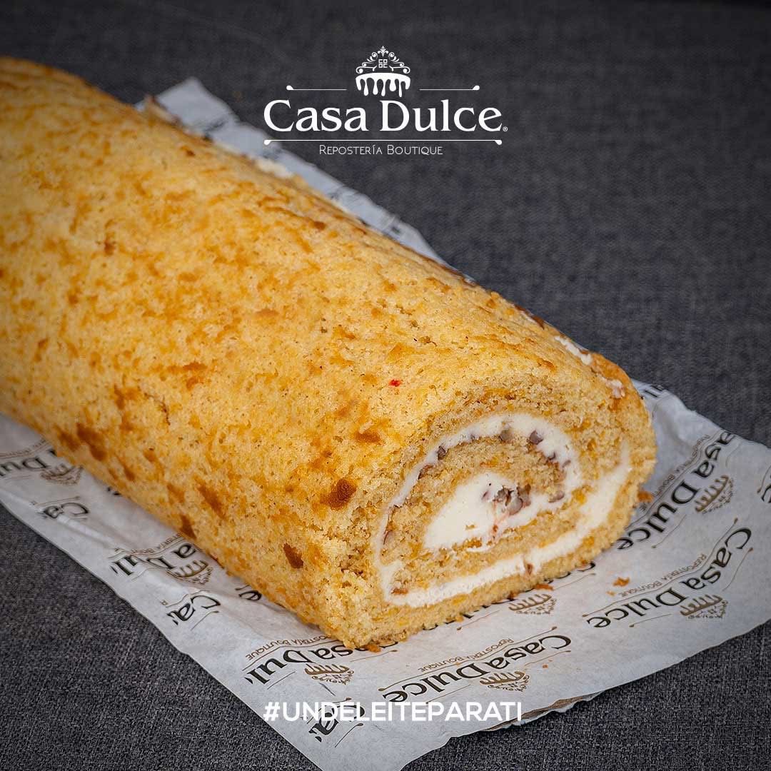 Pan tipo casero sabor naranja bañado con cajeta y nuez.