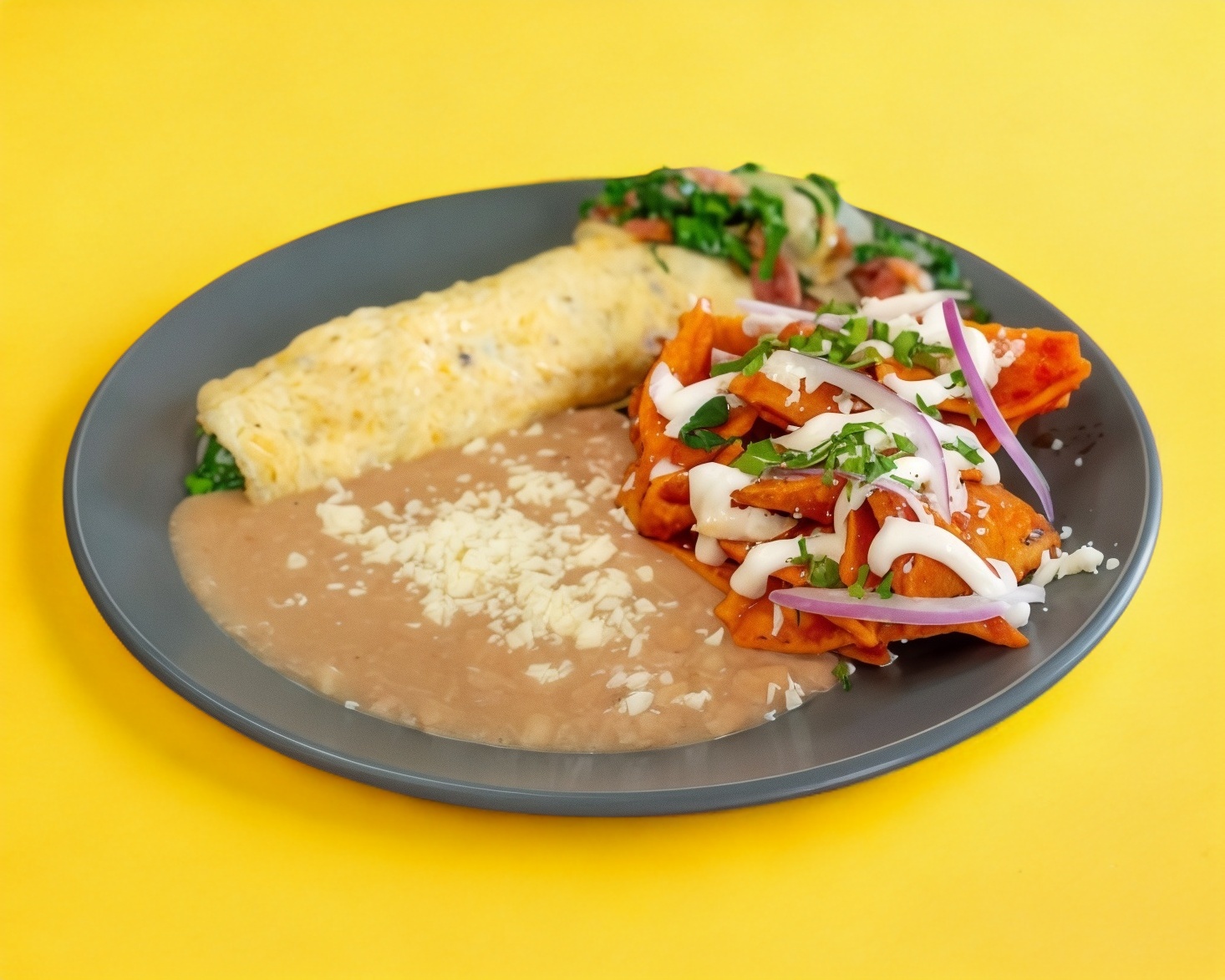 Chilaquiles rojos acompañados de frijoles con queso, crema, cebolla y Cilantro.