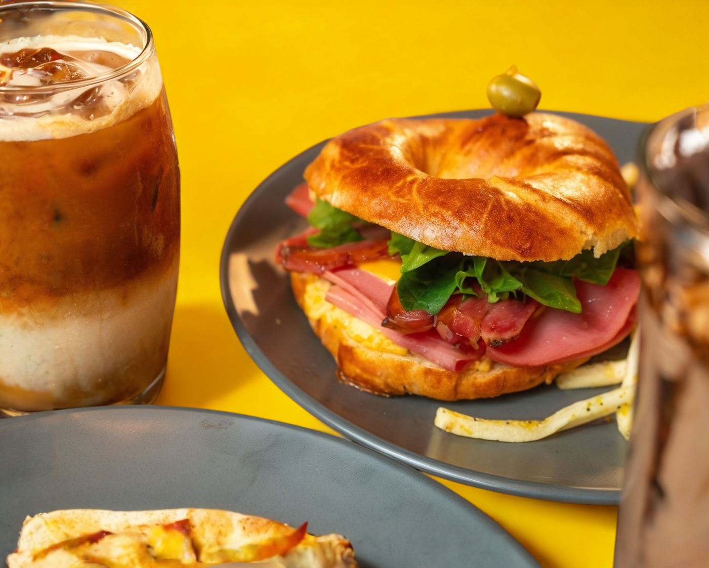 Pan de masa madre, jamón de pavo, panela y vegetales frescos, acompañados de papas a la francesa