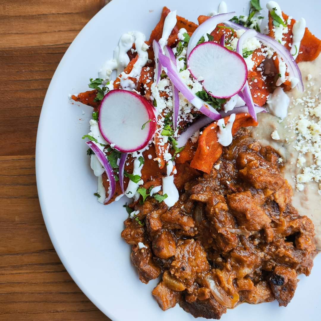 Chicharrón de cazo en salsa morita acompañados de chilaquiles y frijoles