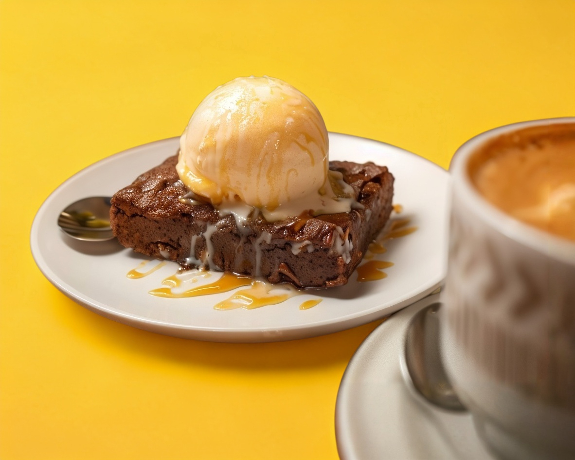 Brownie con helado de vainilla y salsa de caramelo