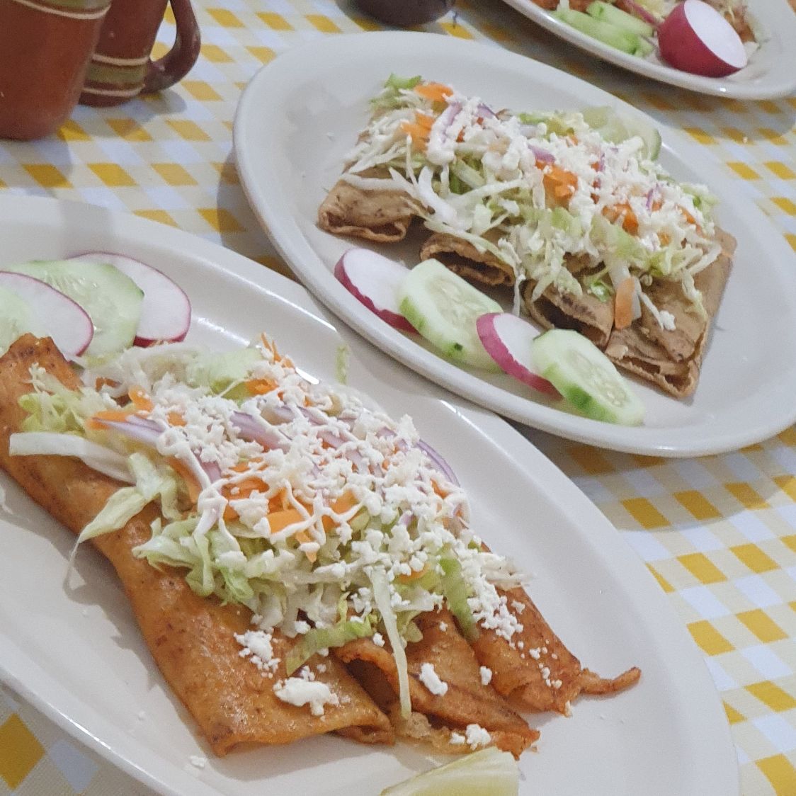 Orden de 3 enchiladas rellenas de papas. Con crema y queso. Verduras, salsa y picante aparte.