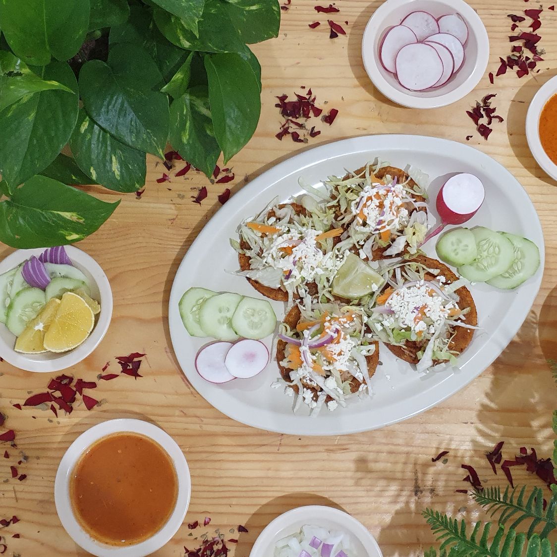 Orden de 4 sopes de papa. Con verdura, salsa y picante aparte.