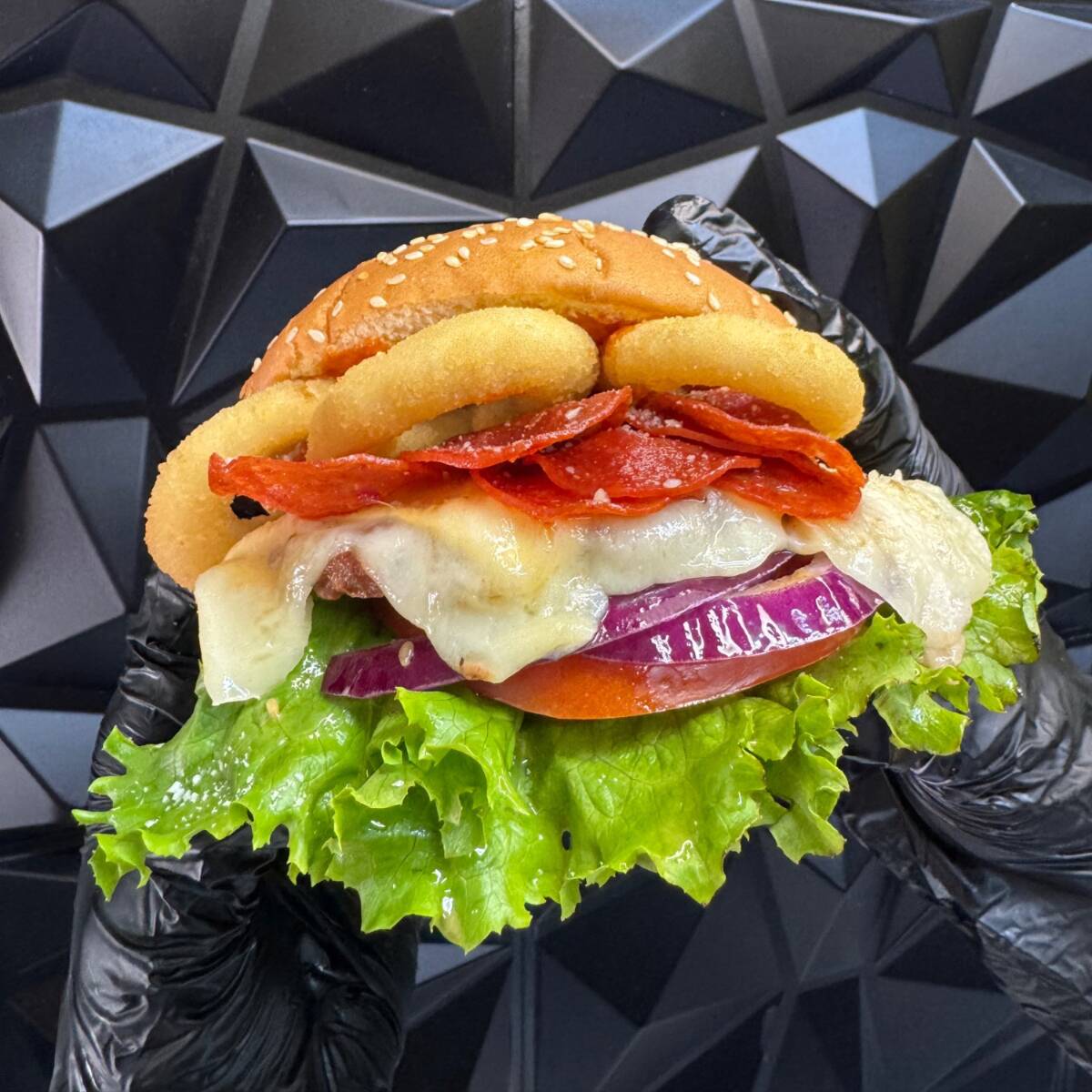 Carne, pepperoni, BBQ, mezcla de quesos, aros de cebolla y papas (100 gr).