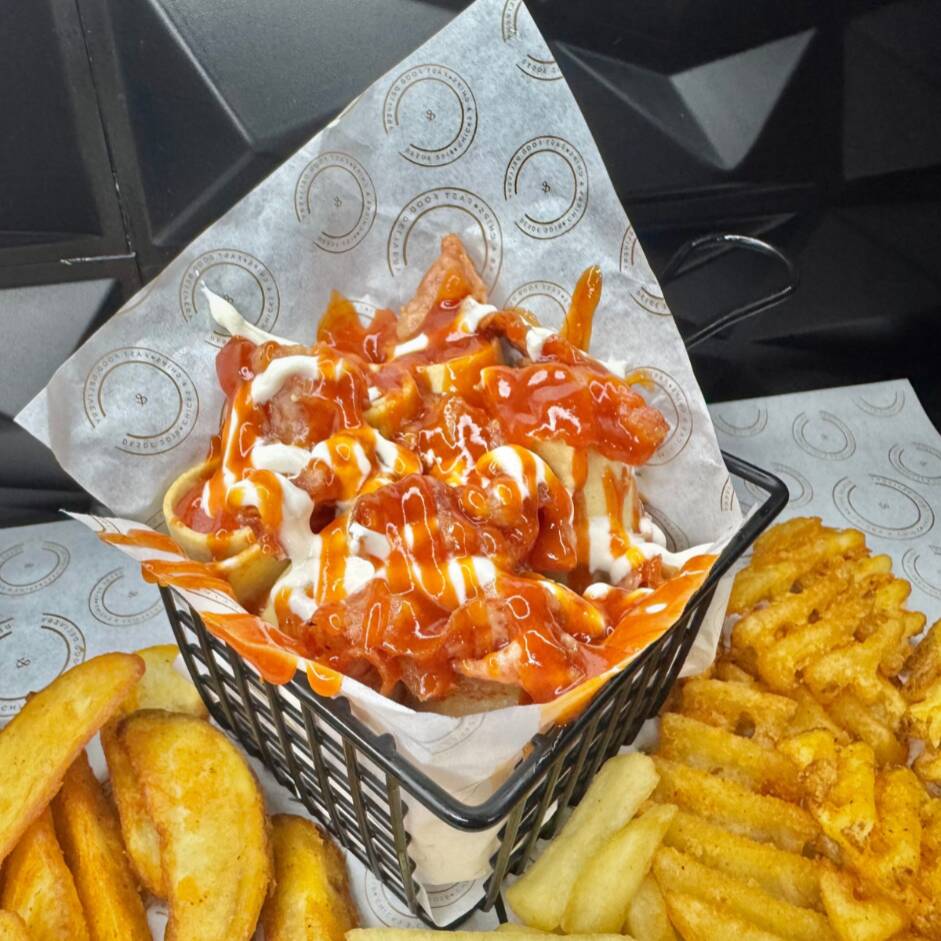 Deliciosa hamburguesa de boneless (150 gr) con tu salsa favorita, queso amarillo y papas francesa, gajo ó waffle (100 gr). Acompañada por aderezo ranch ó catsup, mostaza y picante.