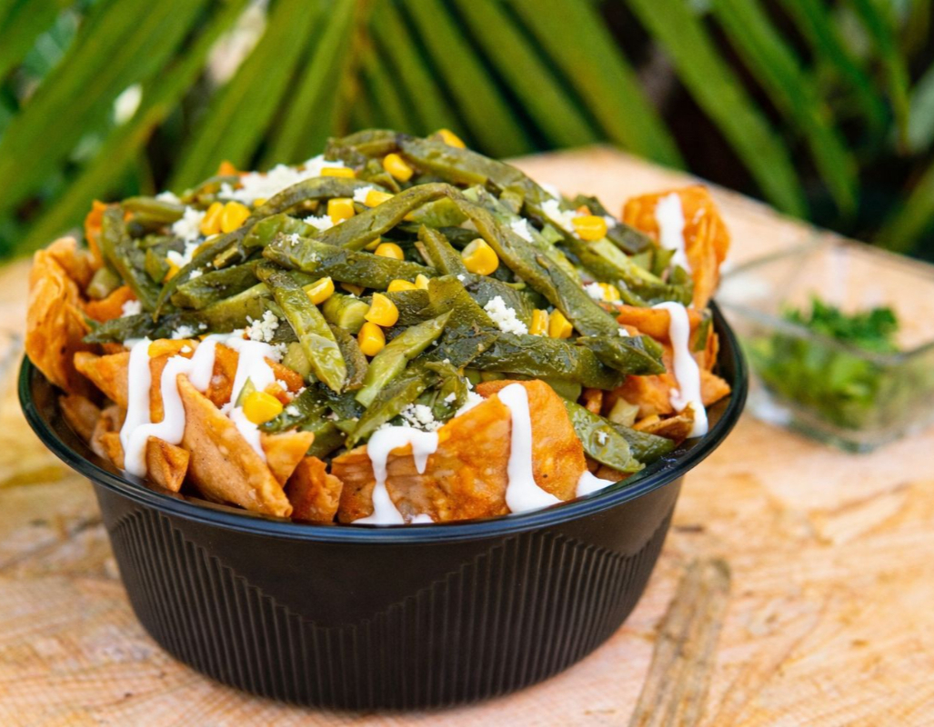 Una abundante porción (aprox. 25 a 30oz) de crujientes totopos bañados en la salsa de tu elección, acompañados de una rica capa de frijoles. Con Rajas de Chile poblano y elote, , queso fresco, crema, cilantro fresco y cebolla para darle ese toque auténtico. Todo esto acompañado de una salsa chilena . El empaque puede variar, pero la porción se mantiene constante.