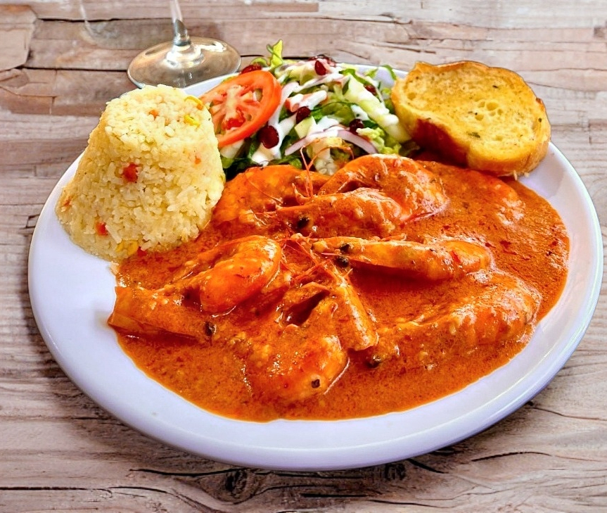 Camarones bañados en crema de chipotle acompañados de Arroz, ensalada fresca y baguette.