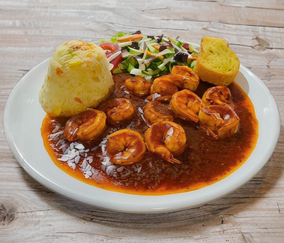 Camarones en salsa a base de cátsup con un toque de chipotle acompañados de arroz, ensalada fresca y baguette.