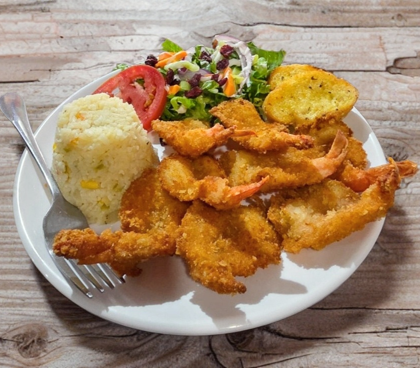 Camarones empanizados crujientes, acompañados de arroz, ensalada fresca y baguette