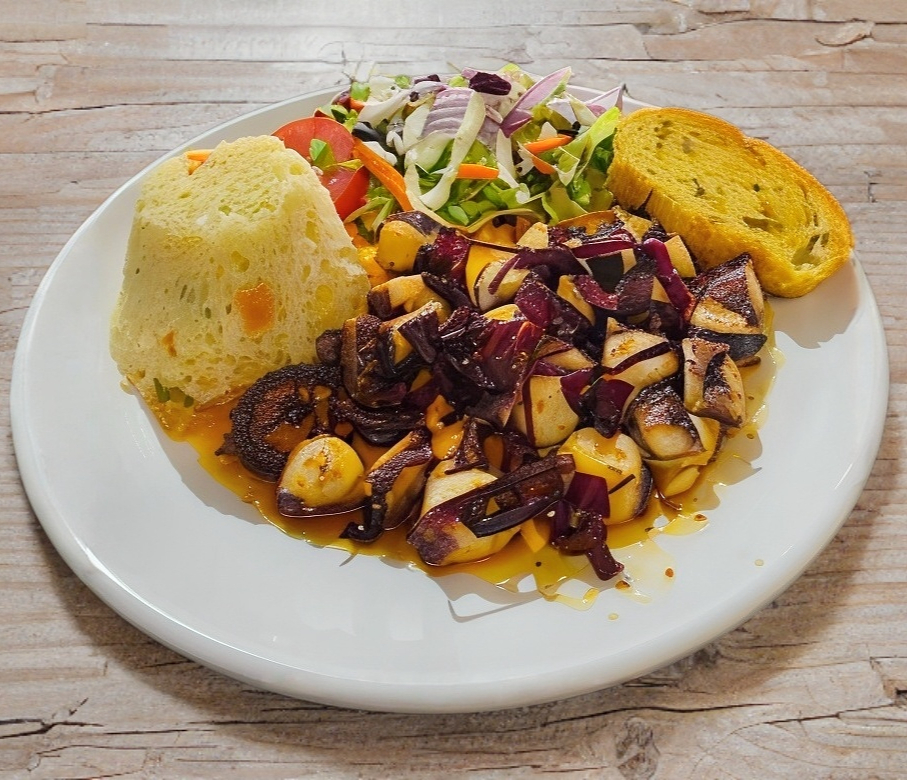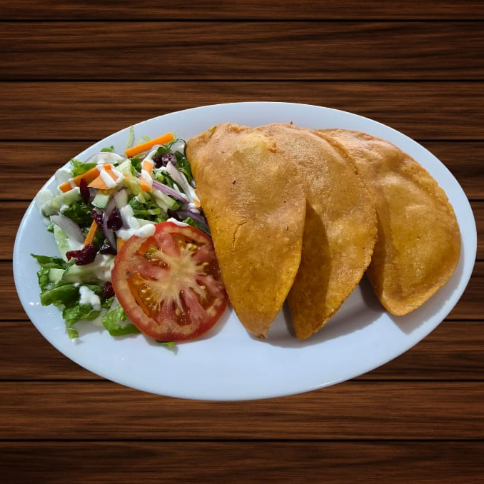 3 pzs. de empanadas rellenas de pulpo, acompañada con ensalada fresca y aderezo.