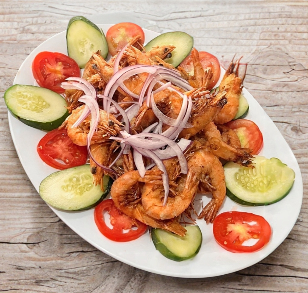 Crujientes camarones a la cucaracha estilo Acaponeta, acompañados de peino, jitomate y cebolla.
