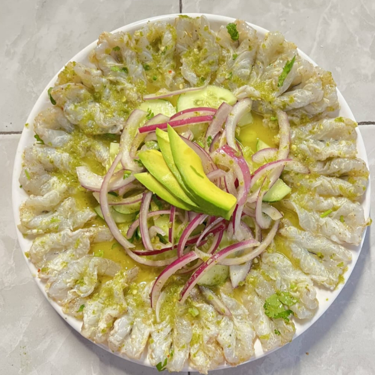 Camaron crudo, acompañado de cebolla, pepino y aguacate bañado en salsa de chile de arbol.