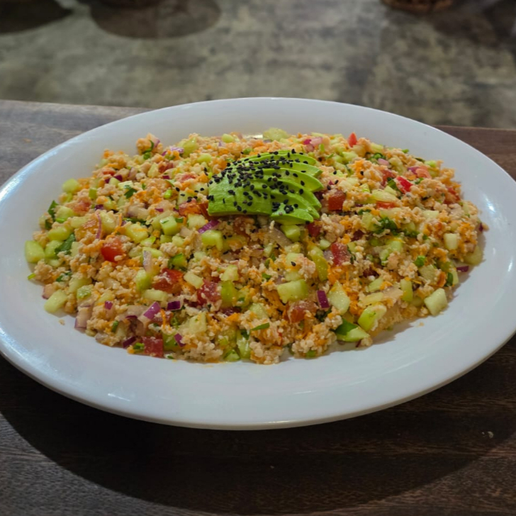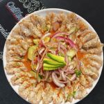 Camaron Crudo acompañado de pepino, cebolla y aguacate bañado en salsa negra de la casa.