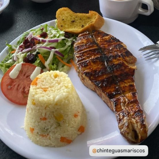 Salmon bañado en salsa de la casa y cocinado al carbón, acompañado de arroz ensalada fresca y baguette.