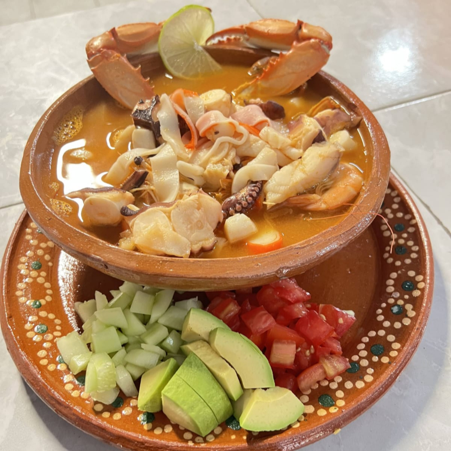 Platillo tradicional que combina Jaiba, camaron, pulpo, calamar, callo de almeja pescado y surimi que se integran en un caldo delicioso.