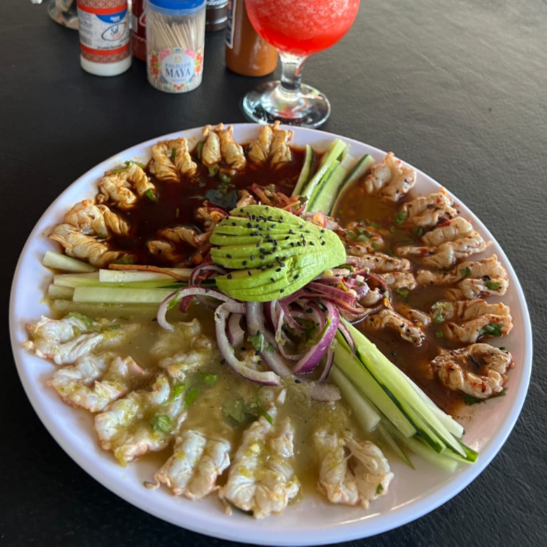 Camaron crudo acompañado de pepino, cebolla y aguacate. Dividido y bañado con salsa verde, roja y negra.