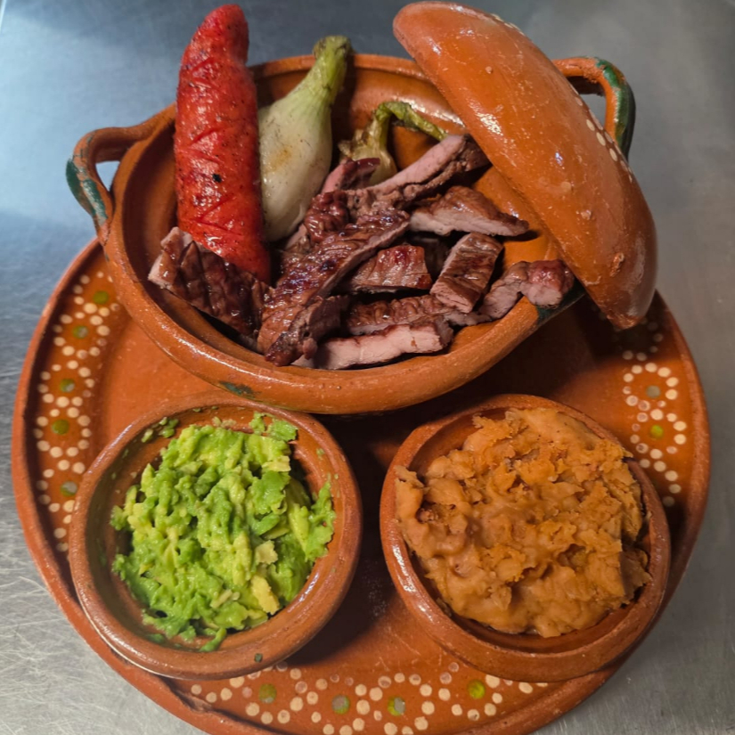 Jugosa arrachera marinada con guarnicion de frijoles puercos y guacamole, acompañada de chorizo y cebolla cambray (incluye tortillas)