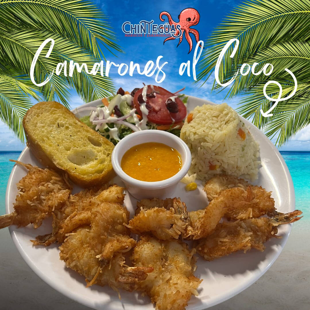Camarones al coco acompañados de salsa de mango, arroz, ensalada fresca y baguette.