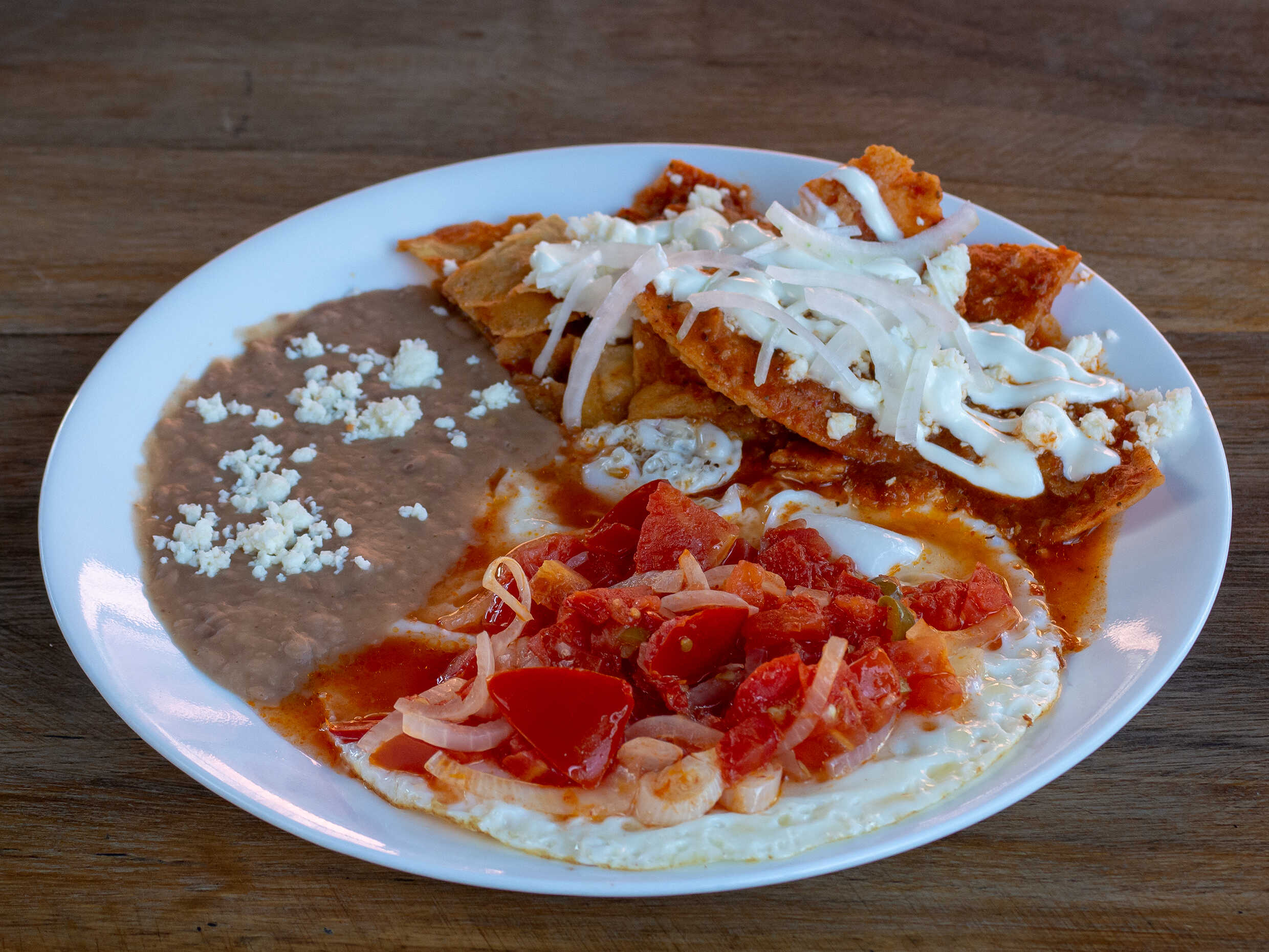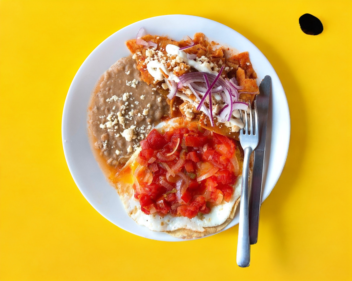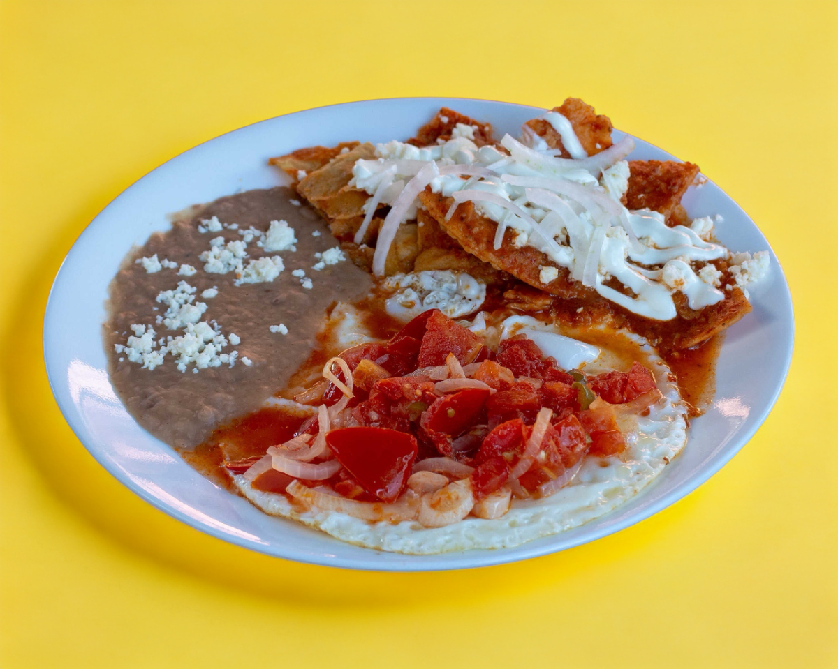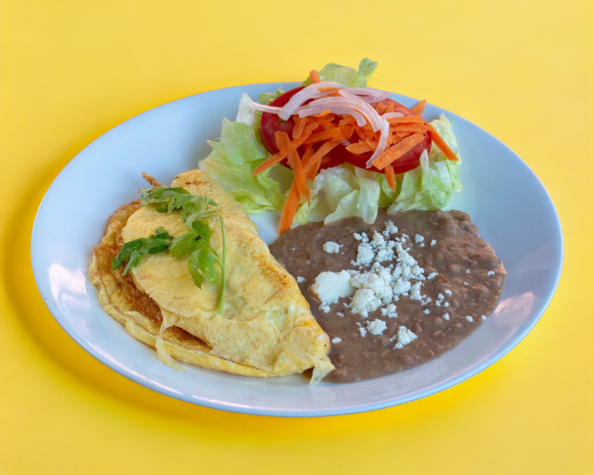 Tortilla doradita con dos Huevos estrellados encima, bañados con nuestra salsa ranchera de la casa, Acompañados de ensalada y frijoles.