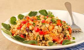 Huevo revuelto guisado con jitomate, cebolla y chile, acompañados de ensalada y frijoles.