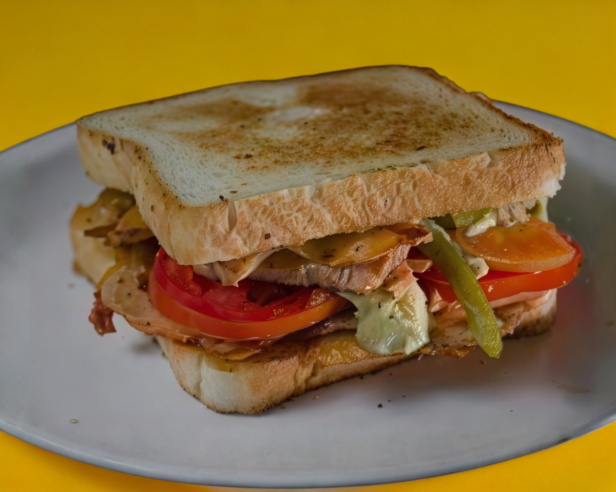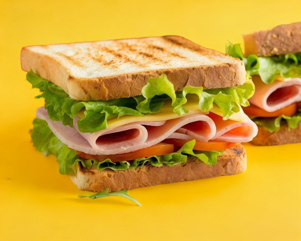 Pan integral con jamón de pavo, queso amarillo o asadero, jitomate, cebolla y lechuga.