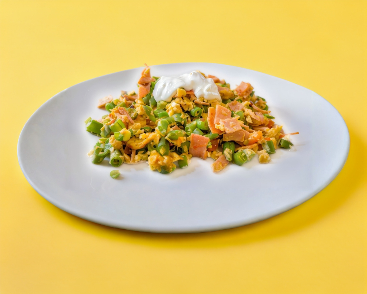 2 huevos 70 GR de Huevos revueltos hoki con tiernos ejotes guisados a la mexicana, acompañados de ensalada y frijoles.