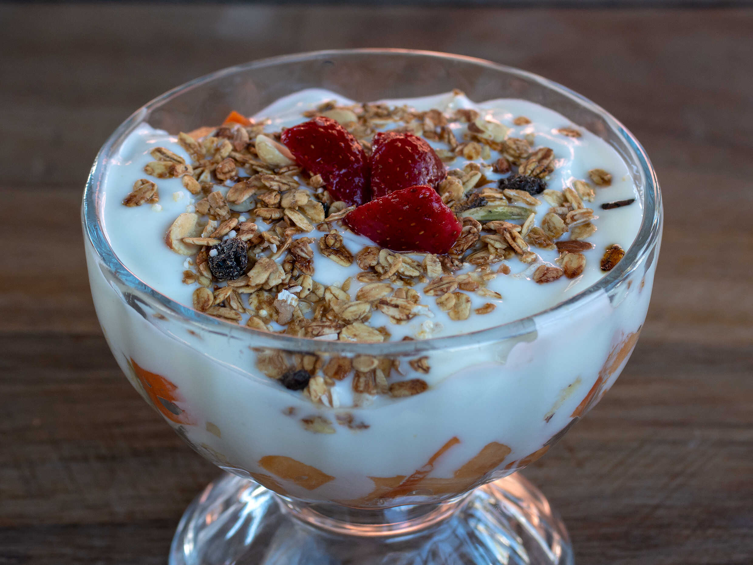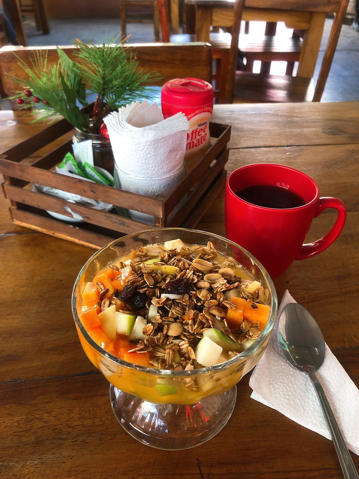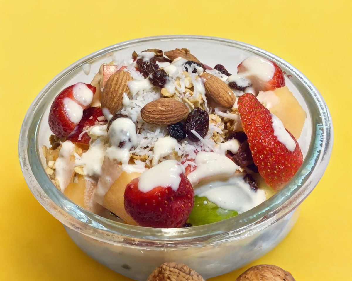 Manzana verde, guayaba, papaya, melón y plátano con granola y yogurt natural.