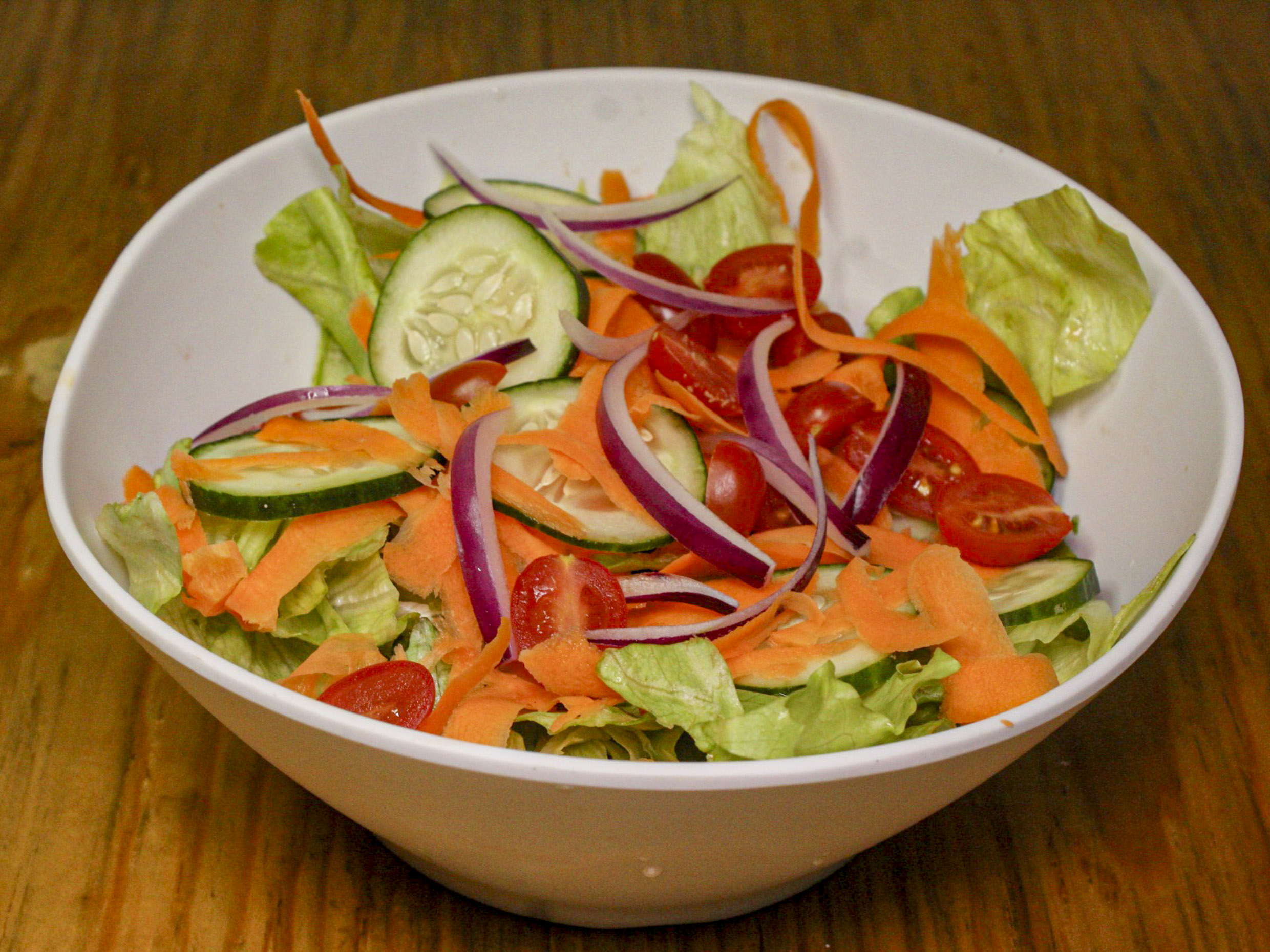 Ensalada preparada con lechuga, zanahoria, pepino, jitomate, cebolla y cubitos de panela fresca, con un toque de aceite de oliva, acompañada de aderezo ranch y crutones