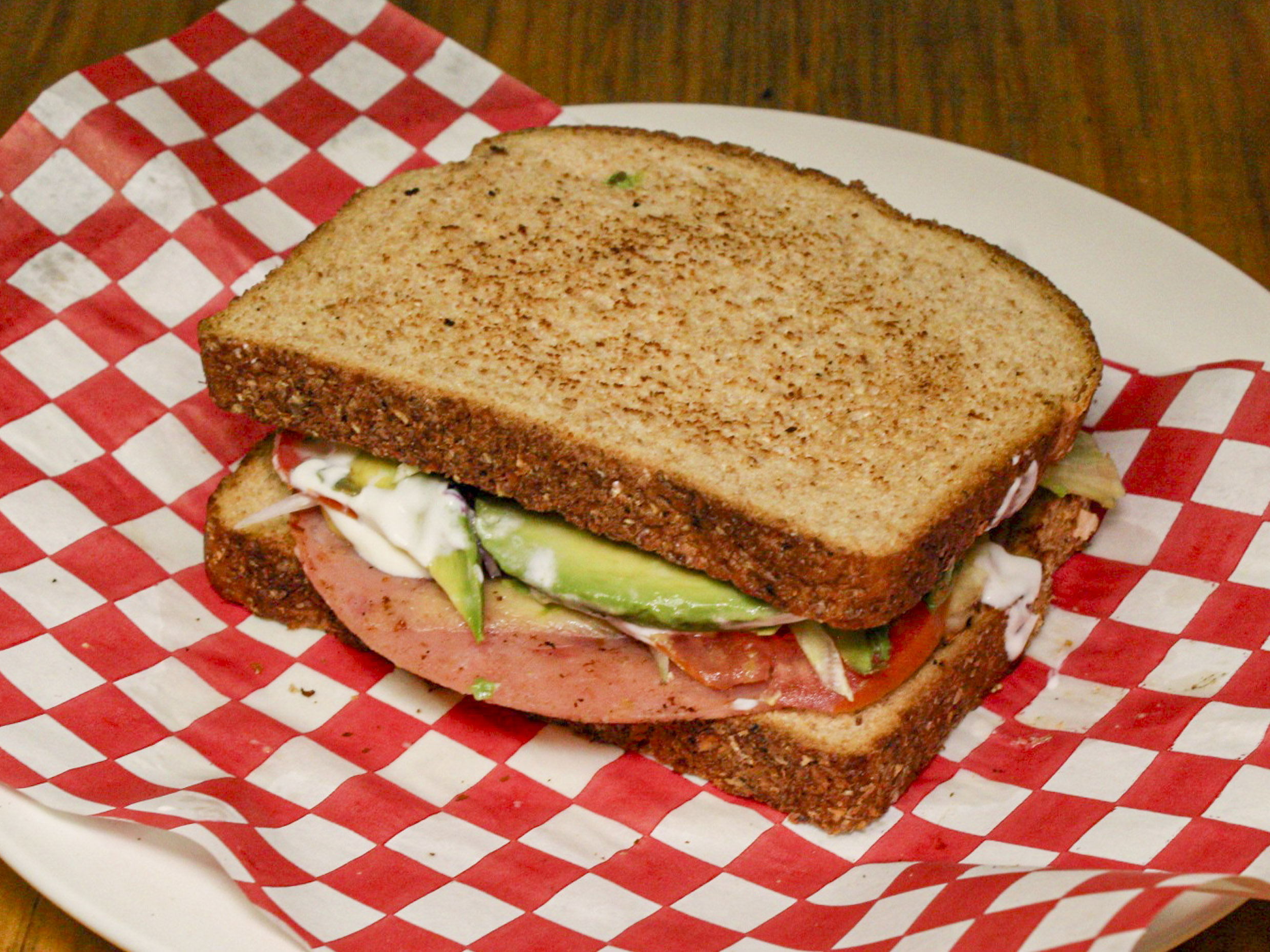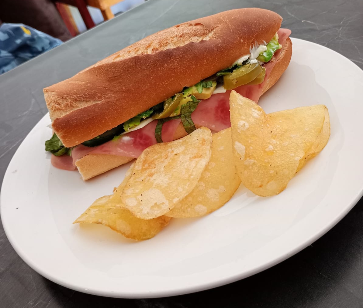 Preparado con pan integral, jamón de pavo, queso americano, cebolla, jitomate, aguacate y lechuga y aderezo, acompañado con papas fritas