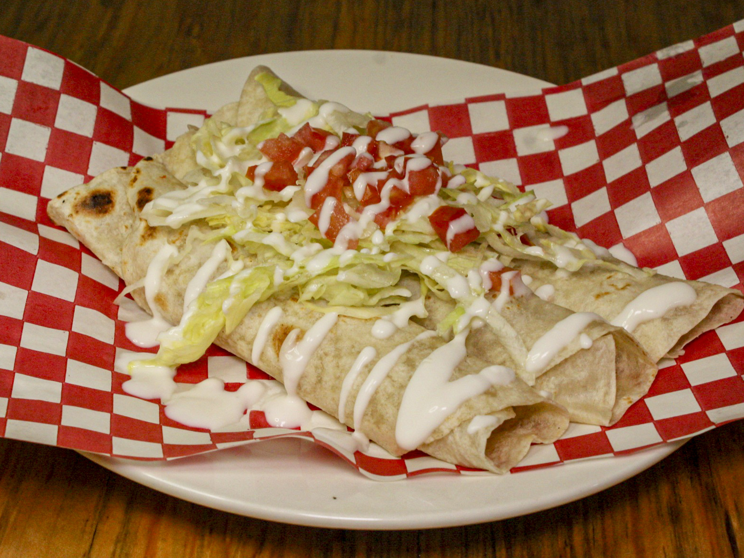 Elaborado con dos tortillas de harina, queso gratinado y carne de pierna adobada, acompañada de frijoles refrito y una ensalada con lechuga fresca, cebolla, jitomate y pepino.