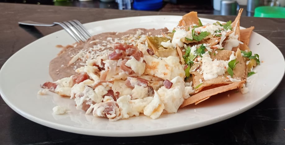 Elaborado con totopos, bañados en salsa de tomatillo y chiles verdes, acompañado de frijoles refritos, crema, queso cotija, cebolla, cilantro y pan