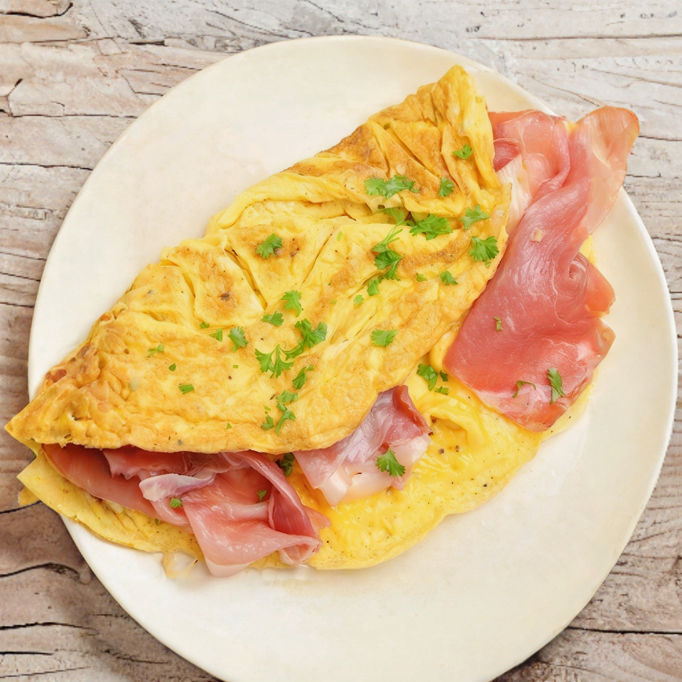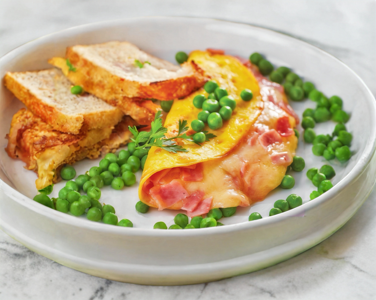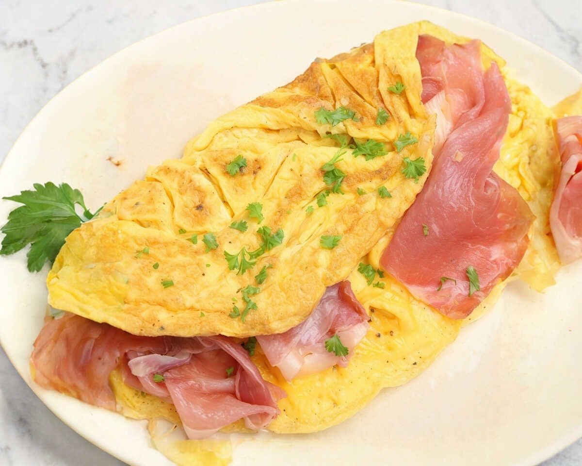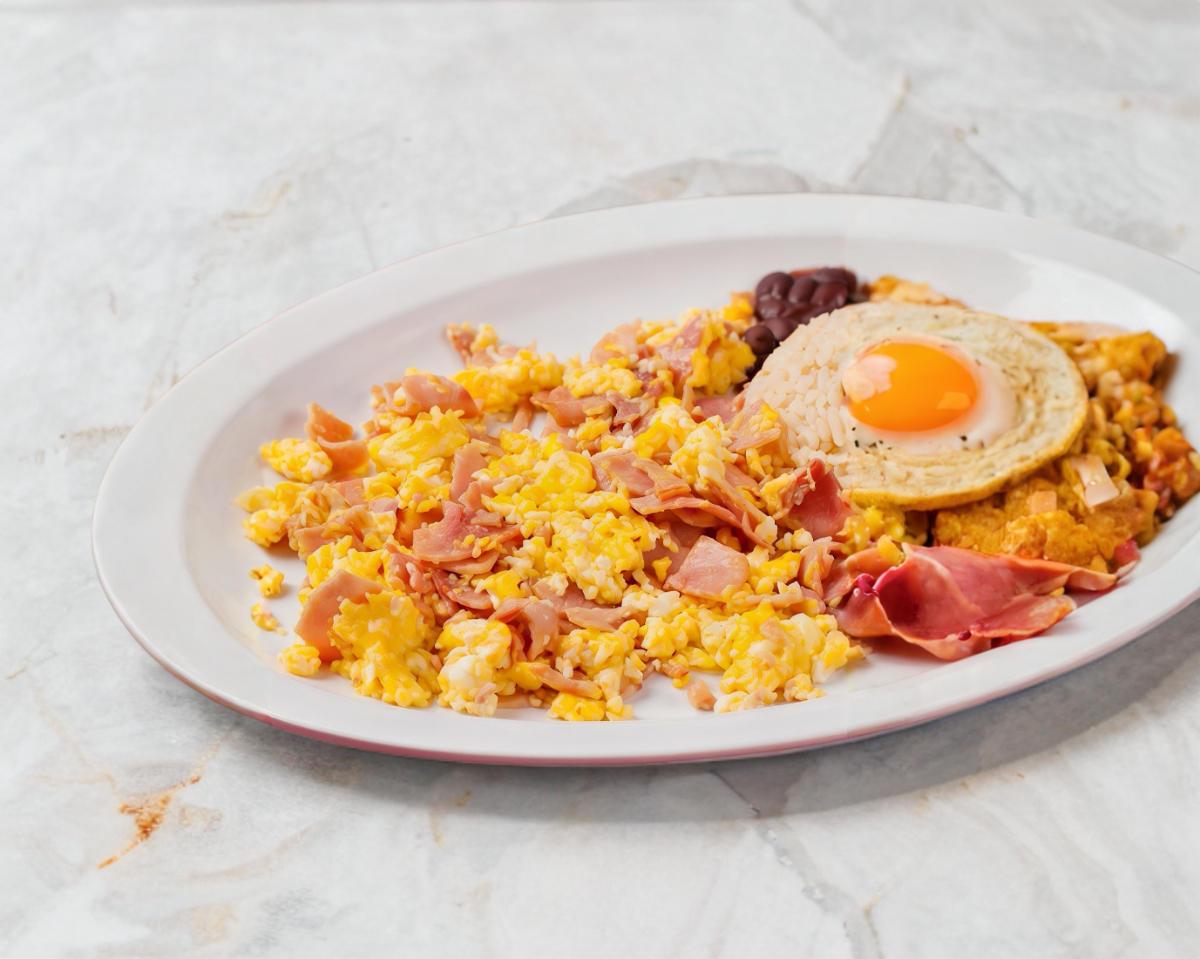 3 huevos con jamón, queso para fundir, ensalada de lechuga y frijoles.