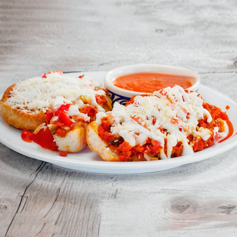 Mollete con frijoles, chorizo, queso para gratinar y salsa mexicana.