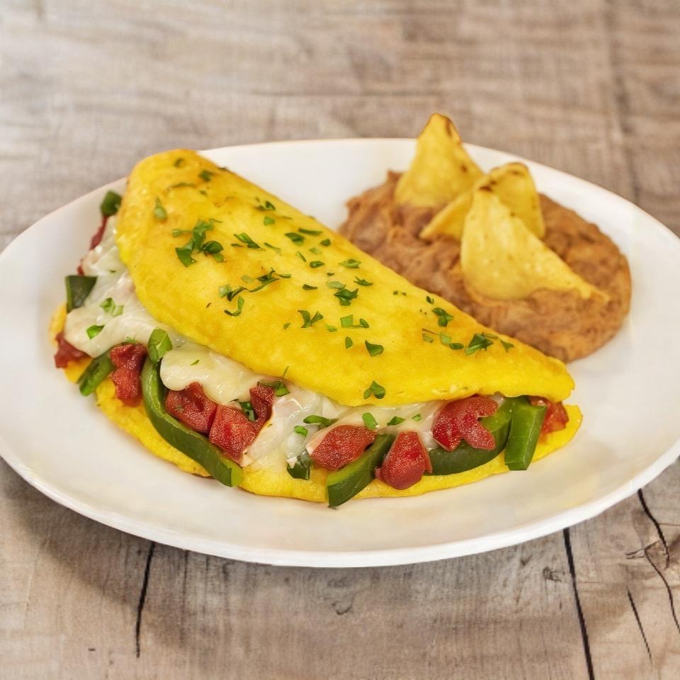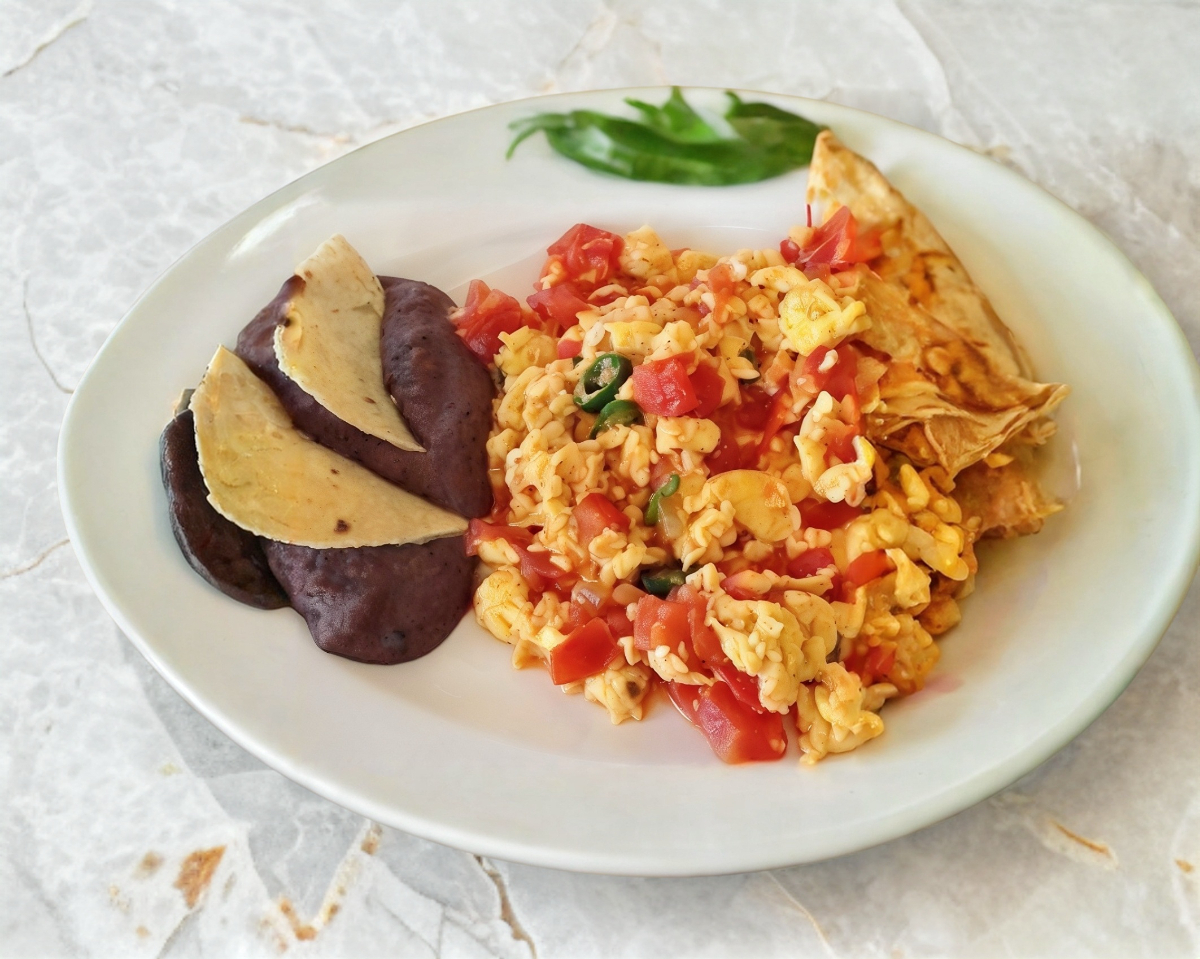 3 huevos con chorizo, queso para fundir, ensalada de lechuga y frijoles.